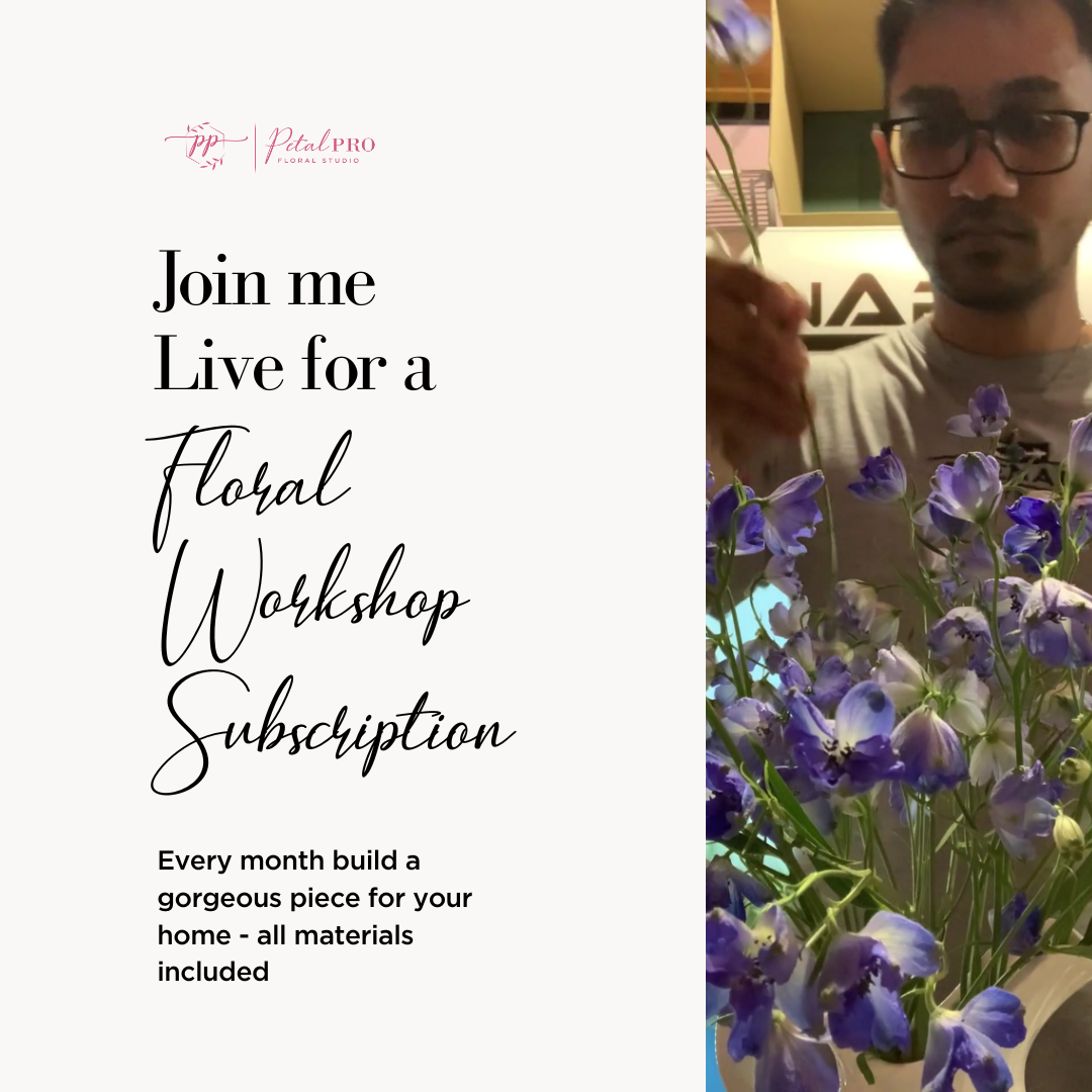 With this monthly subscription course, we send you the flowers and you build the arrangement with Chris virtually and in real time. The result - a beautiful piece in your own home that you can boast that you built.