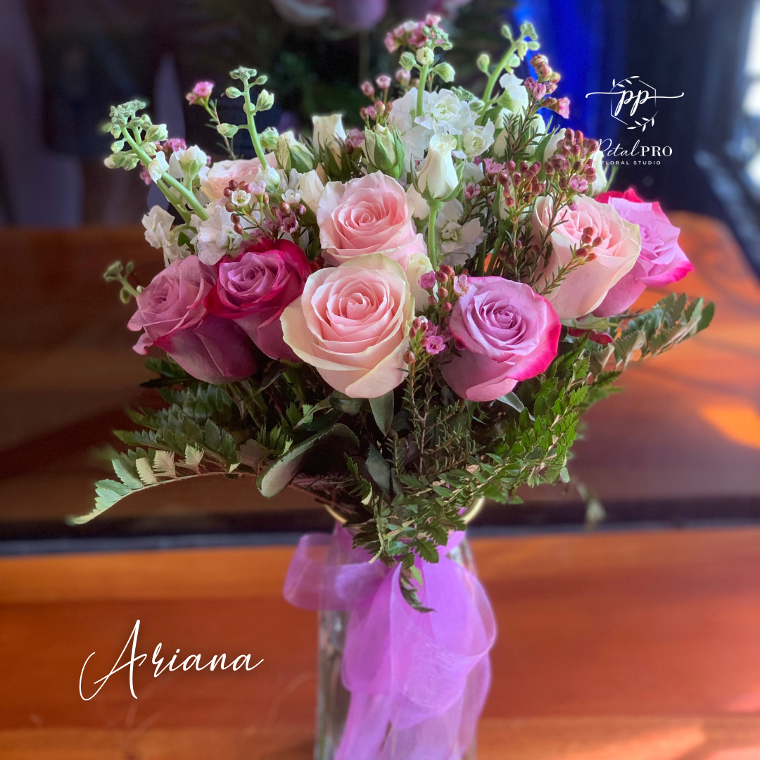 Ariana is an elegant arrangement featuring lilac and pink roses harmoniously paired with pristine white matthiola and delicate spray roses. Accented with subtle waxflower, this sophisticated bouquet exudes timeless beauty and refined charm.