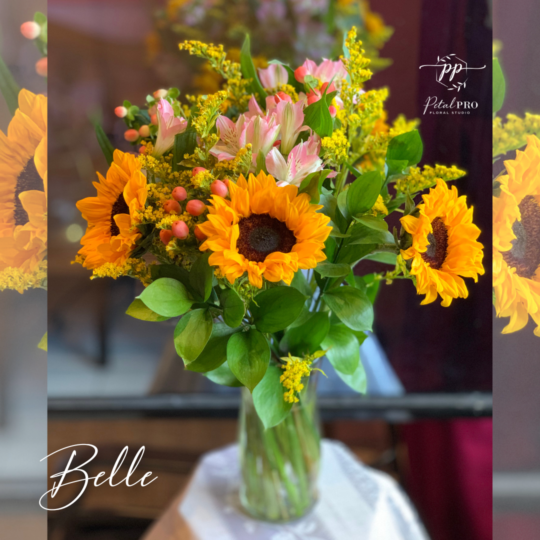 Bring a bright burst of summer into any room with Belle! This beautiful arrangement of sunflowers, alstromerias, and hypericum in a vase is sure to put a smile on anyone's face. Let Belle brighten up your day!