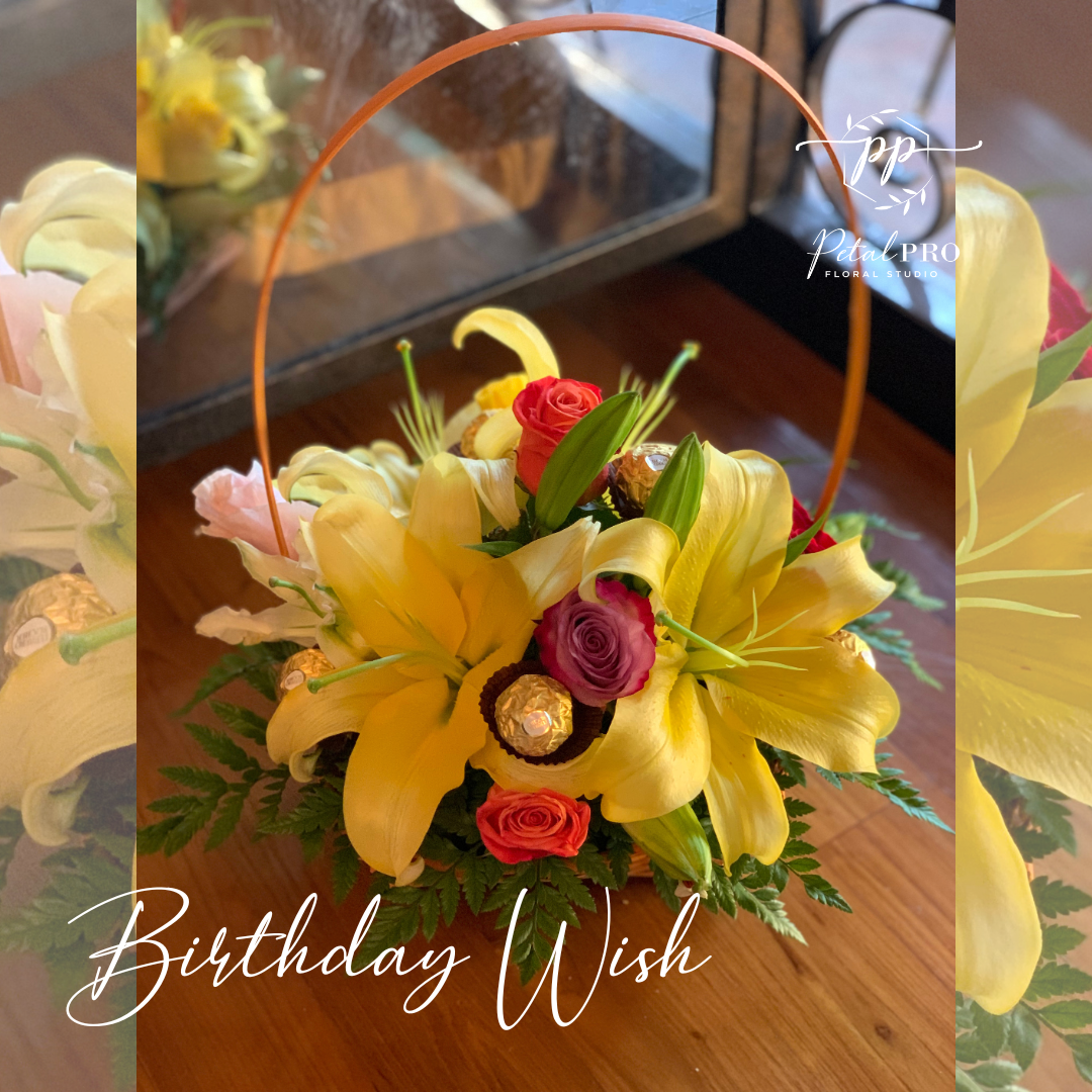 "Make their birthday wish come true with this delightful gift basket! Featuring a gorgeous arrangement of roses, lilies, alstroemerias, and a sweet surprise of chocolates, it's the perfect way to show your love. Don't miss out on this special gift, available for just $400!"