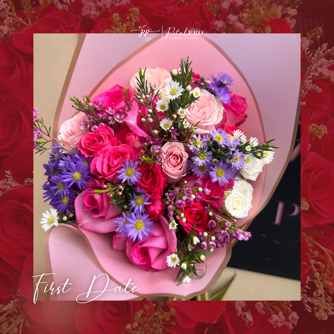 Pink roses, with asters and waxflower and premium wrapping. Clean, confident and romantic - for when you want to make an impression without doing too much.