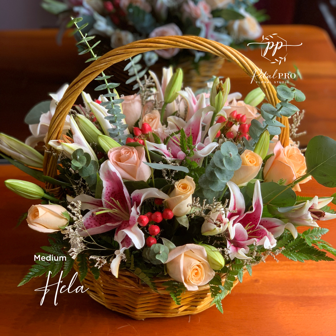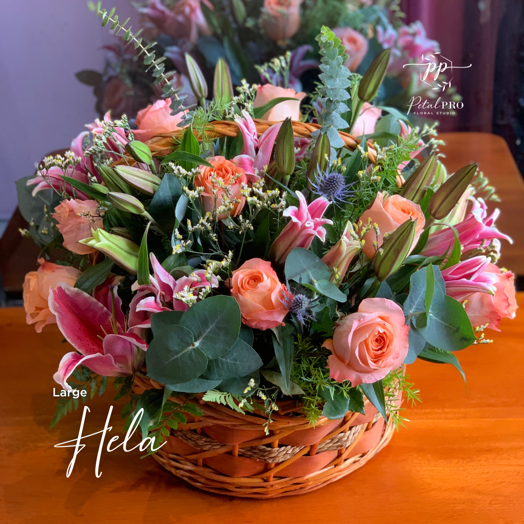 Introducing Hela, a stunning basket arrangement featuring roses, thistles, lilies, and eucalyptus for a captivating balance of texture and colour. Elegantly arranged in a basket, this bouquet will bring a touch of sophistication and beauty to any home.