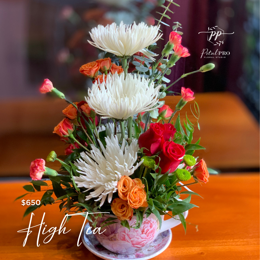Treat Mom to something special this Mother's Day: our delightful High Tea! This fragrant selection of cremons, roses, and spray roses comes in a beautiful teacup, making it perfect for the occasion. They'll be feeling extra special when they receive this whimsical gift!