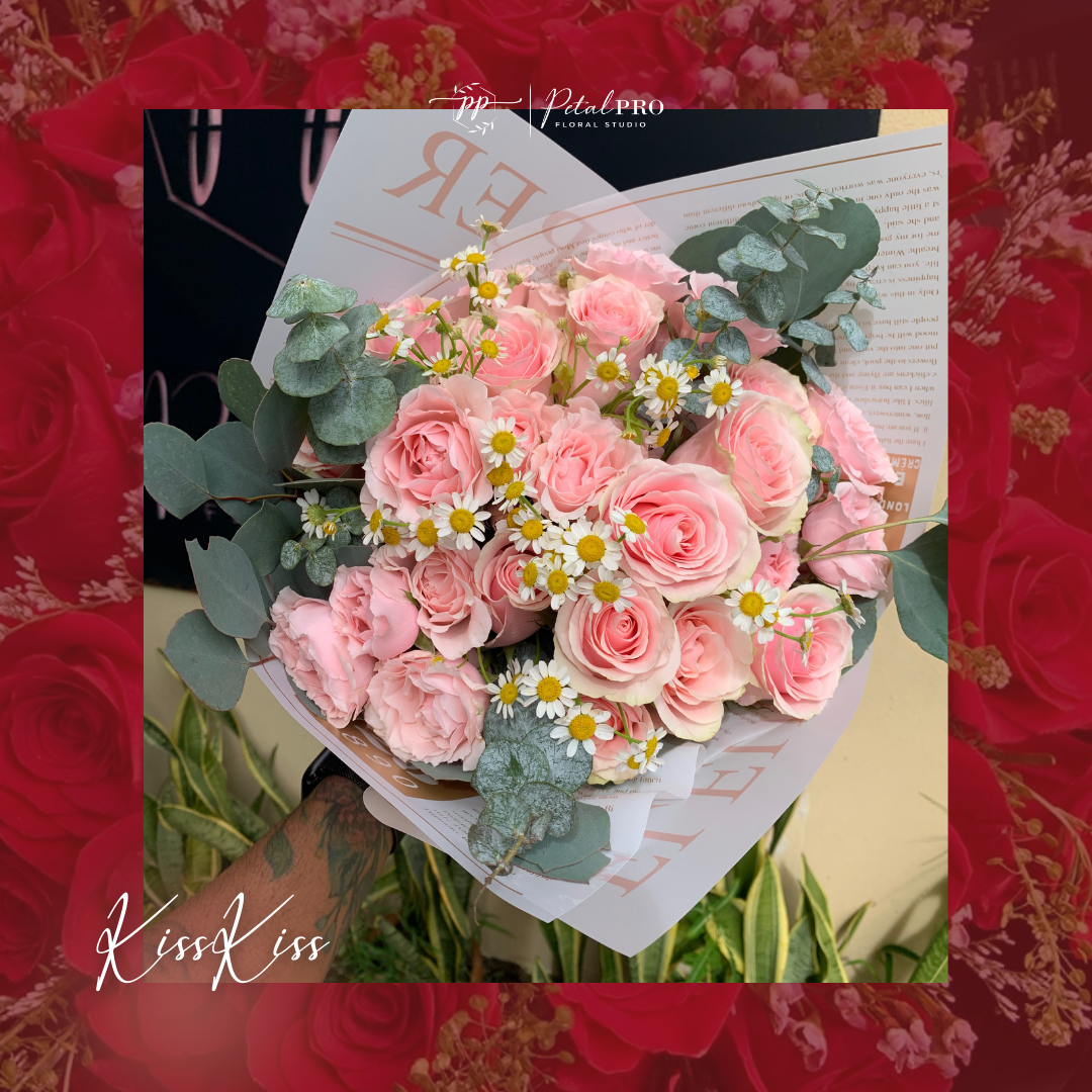 Light pink roses, spray roses, chamomile and eucalyptus styled into a romantic, airy bouquet. Delicate, feminine and effortlessly elegant.
