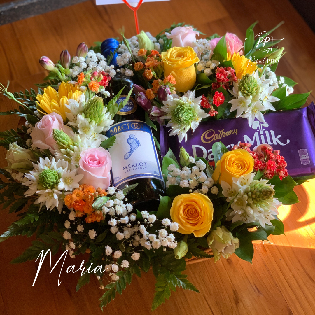 This is perfect as a centrepiece on a coffee table or dinner table without obstructing conversation, or just a little token to say, "I was thinking of you". These flowers complement each other, and the basket adds for a unique, one-of-a-kind presentation.