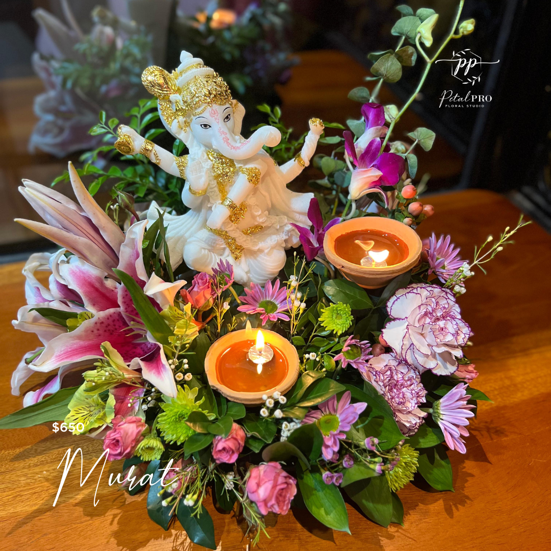 Celebrate Divali with Muraat - a floral arrangement featuring a murti and deeyas. A unique gift, perfect for the occasion. (Flower and deeya power combined!)