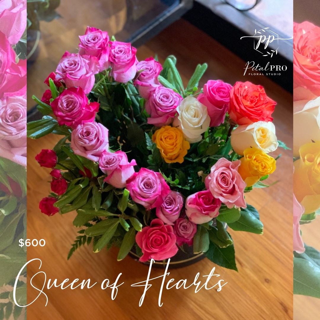 Treat the Queen of your heart to this playful arrangement of 20 roses artfully arranged in a heart shape within a flower box. Show your love with a touch of humor, because who says romance can't be fun?!